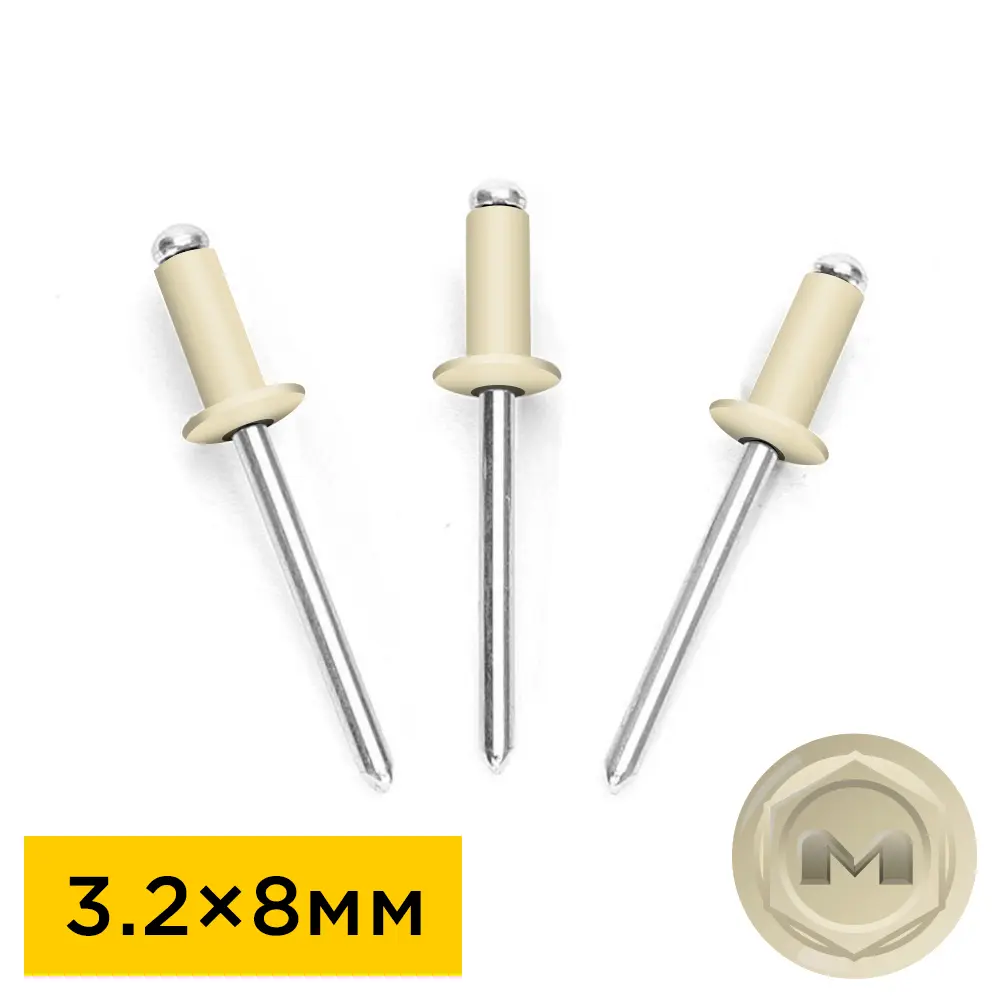 Комбинированные вытяжные заклепки Алюминий/Сталь (Аl/St) диаметр 3.2мм, длина тела 8мм цвет RAL 1015 Слоновая Кость предназначены для соединения различных материалов и частей конструкций, в том числе и таких, к которым доступ открыт только с одной стороны. Их также используют для соединения деталей, не поддающихся сварке. Окраска заклепок осуществляется на собственных линиях покраски бренда Daxmer.