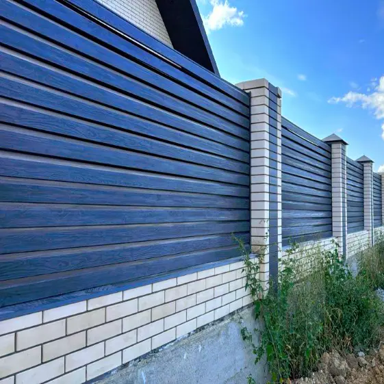 Cтильное современное ограждение — забор-жалюзи с ламелями «Хай-Тек» текстура Черное Дерево 3D покрытие Принтек двусторонний. Его фактура и глубокий оттенок благородного тёмного дерева создают впечатление эксклюзивности и гармонично сочетаются как с классической, так и с современной архитектурой.
